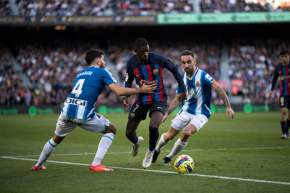 2022年12月,在西甲联赛第15轮比赛中,效力于巴塞罗那队的登贝莱(中)试图突破西班牙人队球员的防守。新华社发(乔安·戈萨摄)