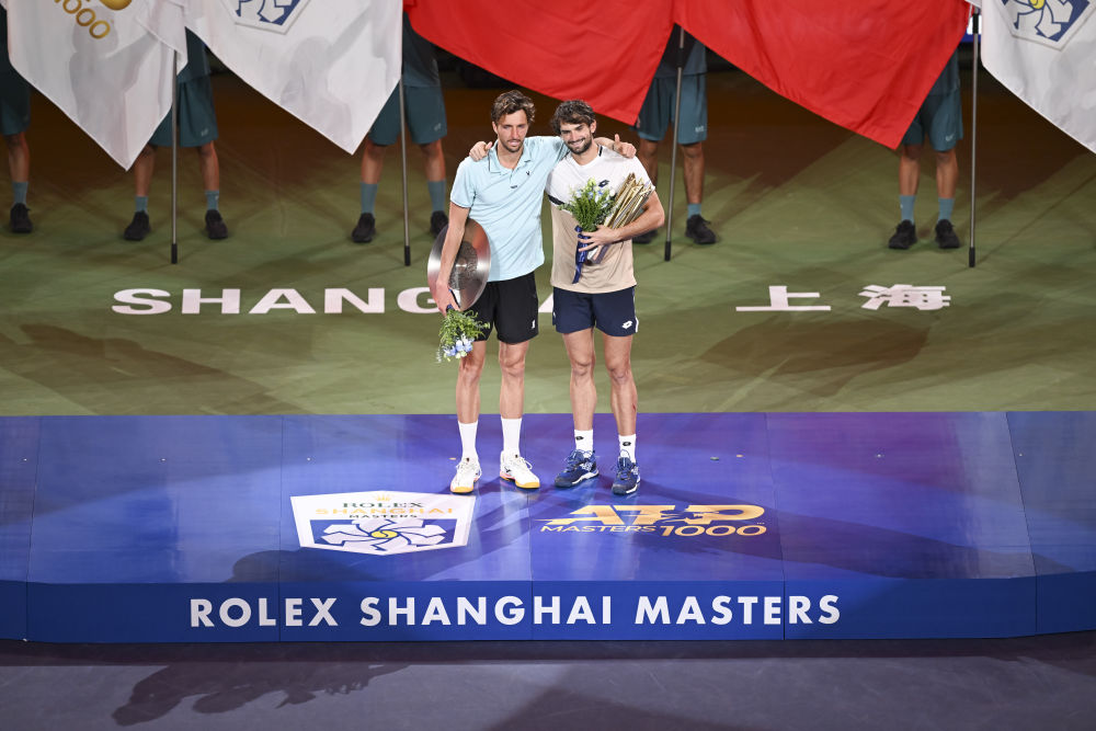 10月12日,瓦舍罗(右)与兰德克内什在颁奖仪式上合影。当日,在2025年ATP上海网球大师赛男子单打决赛中,摩纳哥选手瓦舍罗2比1战胜法国选手兰德克内什,夺得冠军。新华社记者 陈浩明 摄